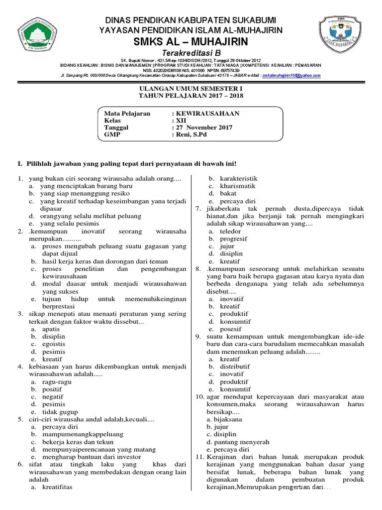 Prakarya dan kewirausahaan kelas xii sma soal ulangan k 13 kelas 6 . Contoh soal ulangan harian kewirausahaan untuk smk. Ada 20 soal kewirausahaan kelas xii (uts) diartikel ini, dan untuk pembahasan materi, soal kwu kelas xii ini membahas seputar perencanaan, . Soal kewirausahaan kelas 12 semester 1 dan semester 2 sma kurikulum 2013 beserta kunci jawaban nya lengkap dan terbaru, soal pilihan ganda . 07 aug 2016 post a comment soal soal kimia semester 1 kelas xii ulangan umum semester ganjil.